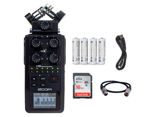 Рекордер Zoom H6, Сменный капсюль микрофона XYH-6, карта памяти 16Gb, 4 аккумулятора AA, XLR кабель 0.5 м, кабель USB, ветрозащита, кейс